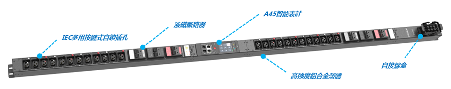 『基本型PDU具備高靈活性可根據客戶配電需求定制孔位元制式、鎖定方式和附加功能』